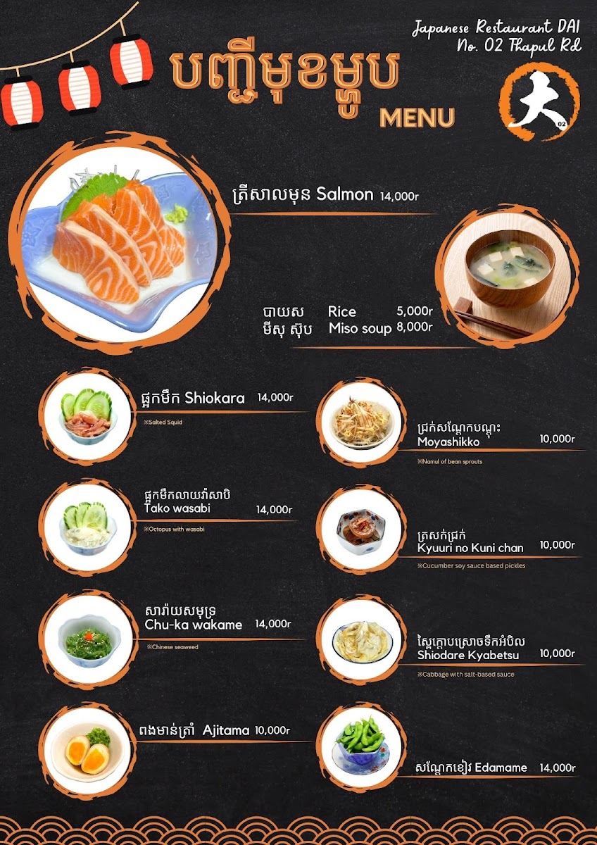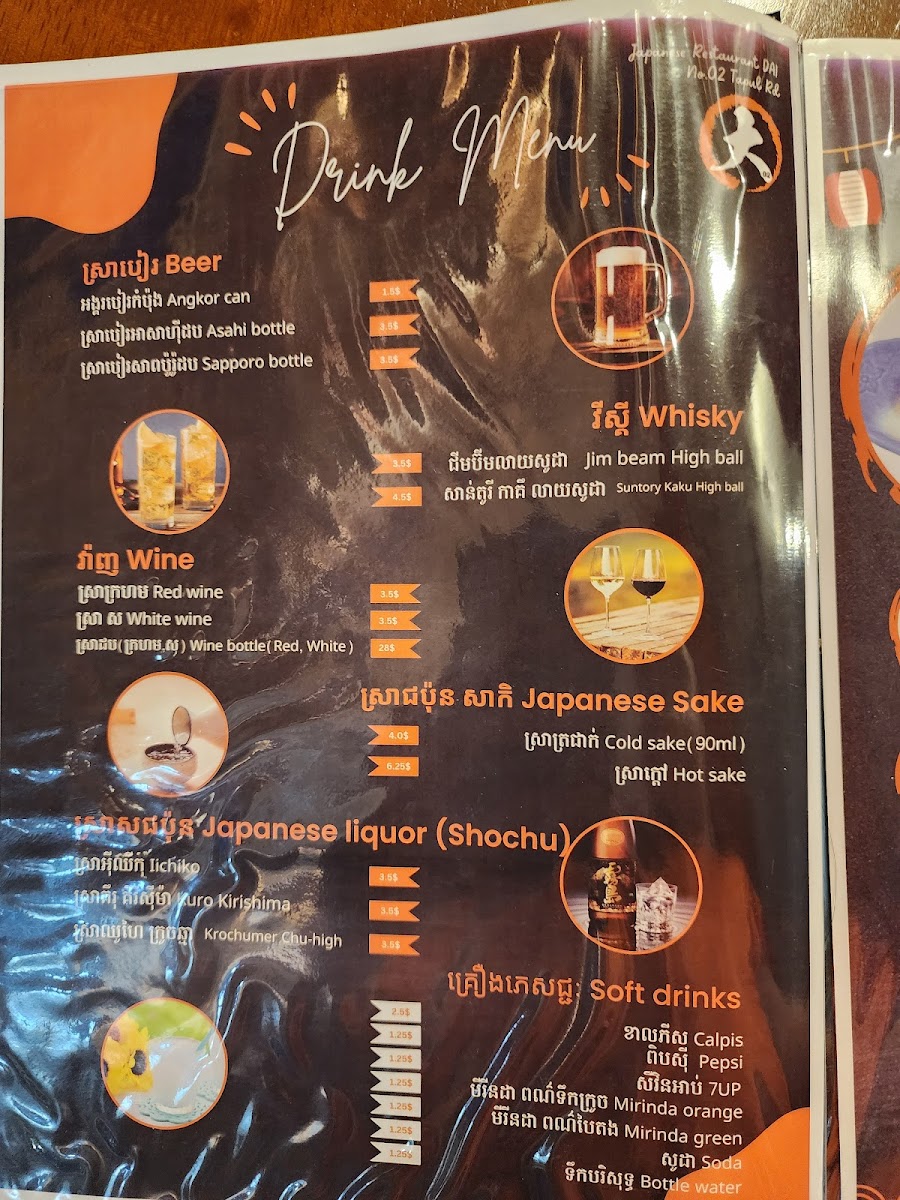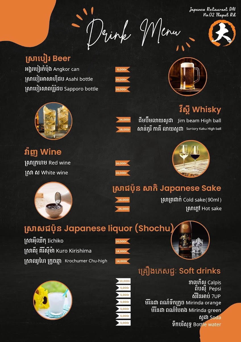 The menu at Japanese Restaurant Dai No.02 in Krong Siem Reap offers a range of dishes and beverages that cater to various tastes. For beer lovers, they serve Sapporo Beer, a classic Japanese brew. The restaurant offers three different sets: the Set Seafood 7P, the Set Meat 7P, and the Set Vegetables 7P, which include seven pieces each, providing a satisfying variety for any diner. In addition to the sets, the drink menu features a selection of refreshing beverages, including 7 Up, Pepsi Can 330ML, Mirinda Orange Can 330ML, Mirinda Green Can 330ML, and Fresh Mineral Water. With this selection, diners can enjoy both hearty meals and refreshing drinks to complement their dining experience.