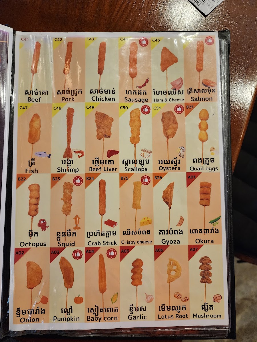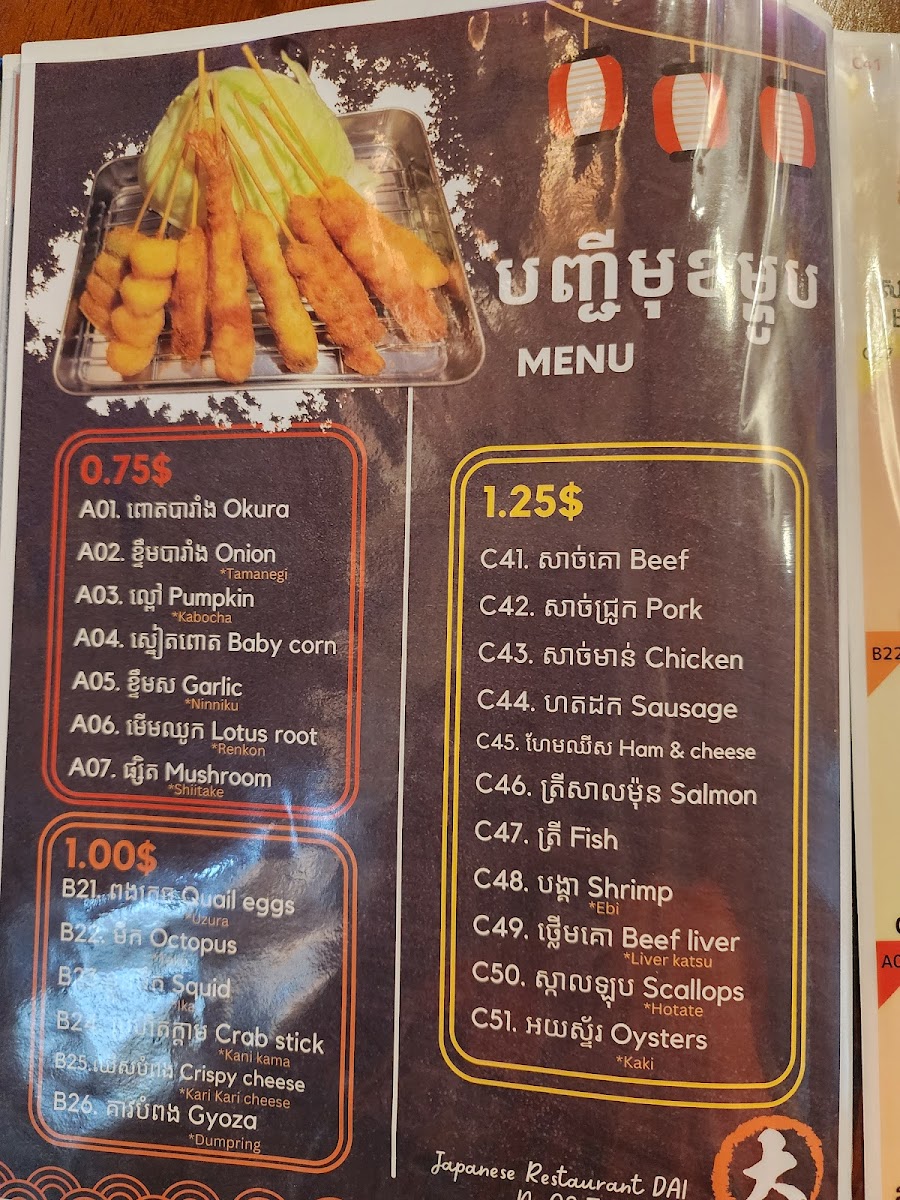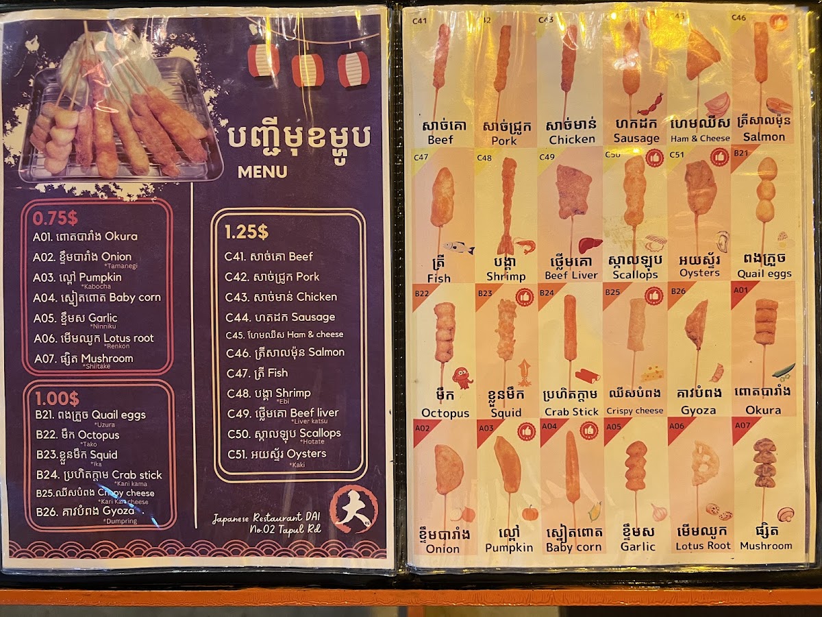 The menu at Japanese Restaurant Dai No.02 in Krong Siem Reap offers a range of dishes and beverages that cater to various tastes. For beer lovers, they serve Sapporo Beer, a classic Japanese brew. The restaurant offers three different sets: the Set Seafood 7P, the Set Meat 7P, and the Set Vegetables 7P, which include seven pieces each, providing a satisfying variety for any diner. In addition to the sets, the drink menu features a selection of refreshing beverages, including 7 Up, Pepsi Can 330ML, Mirinda Orange Can 330ML, Mirinda Green Can 330ML, and Fresh Mineral Water. With this selection, diners can enjoy both hearty meals and refreshing drinks to complement their dining experience.